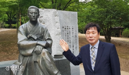 최규목 이상화기념사업회 이사장이 지난 21일 대구 달서구 두류공원 이상화 동상과 시비 앞에서 이상화 선생의 시를 설명하고 있다.