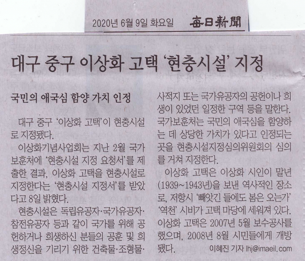 '이상화 고택' 국가보훈처 지정 현충시설로 지정